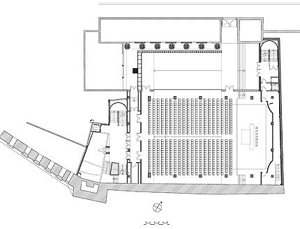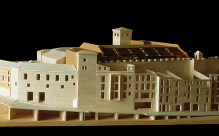 3) Aprovecha la muralla como un elemento definidor tanto desde fuera como desde dentro. En el actual teatro no somos conscientes en absoluto de que uno de sus laterales está directamente apoyado en la muralla de la ciudad. Es una pena que así sea, por esto proponemos redescubrir este monumental muro, sea por la porción de su exterior que las casas que se le han ido adosando aún deja aparente, sea por toda su cara interior. Así conseguiremos una sala única en el mundo, donde uno de sus laterales es una obra de siglos, en su estado primigéneo, con los grandes bloques pétreos a la vista, su corredor superior y sus almenas.