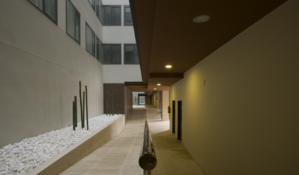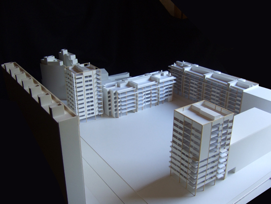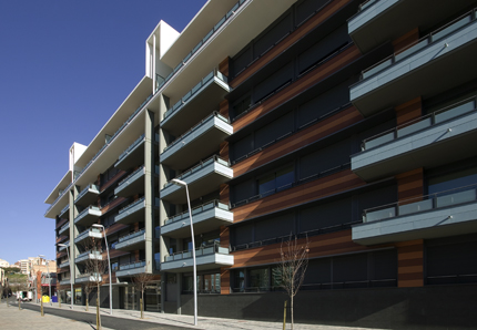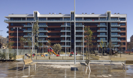 El proyecto comenzó por un replanteo urbanístico de la manzana. En lugar de los tres bloques paralelos de 14 plantas previstos propusimos una edificación perimetral alineada a las calles que rodea una amplia plaza peatonal abierta a Suroeste. Éste es el mayor mérito del proyecto del que tuvimos la oportunidad de proyectar y finalizar el largo edificio situado a Noreste y, relativamente, la plaza. La profundidad edificable, fijada por nosotros, ha permitido situar en fachada todas las estancias de estar, comer y dormir. Baños y cocinas se agrupan alrededor de tres patios centrales que llegan hasta el amplio zaguán. De esta forma se consigue ventilación cruzada en la mayoría de las viviendas.
