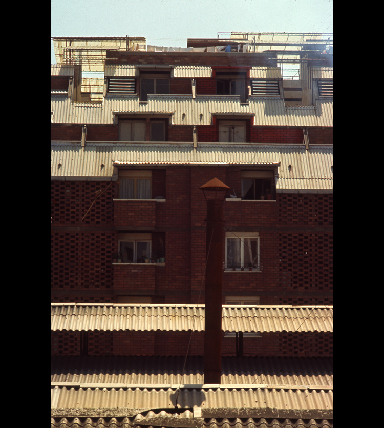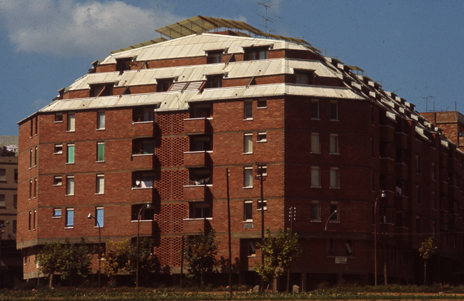 "Nuestra primera experiencia de vivienda colectiva. Auténticas viviendas sociales de construcción extremadamente económica. Por esta razón, agrupamos el acceso, la escalera y los ascensores en un solo núcleo que intentamos hacer lo más digno posible. El diseño de áticos y sobreáticos englobados en una cubierta inclinada con múltiples piezas especiales de fibrocemento fue un reto que sólo nuestra extrema juventud puede explicar."
