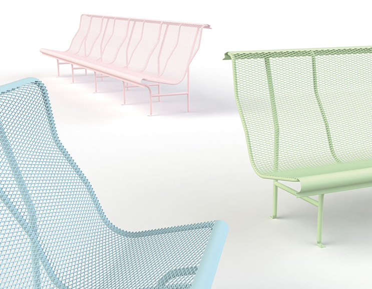 Nosotros hemos descubierto una utilización nueva del deployé a la que se adapta de forma idónea. Este material es elástico, fácil de curvar en un sentido y resistente en el otro, no tiene desperdicios de la chapa de hierro y es muy calado, lo que evita el calentamiento por el sol, permite un secado rapidísimo tras la lluvia y confiere al banco una gran transparencia, efecto que perseguíamos desde el inicio. También hemos introducido una libertad de la longitud total del banco, ya que puede crecer en módulos de un metro.