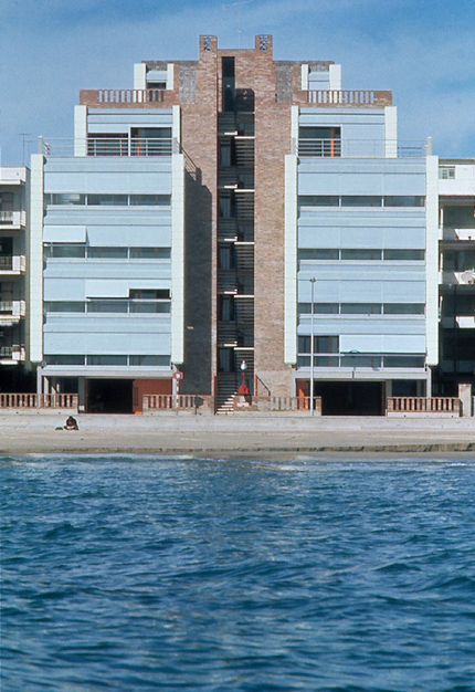 Construcción en primera línea de mar. Disfrutar del mismo era prioritario por lo que el tamaño y diseño de las terrazas se convirtió en el leit-motiv del proyecto. Las terrazas son muy amplias, situadas en esquina y protegidas por persianas arrollables rígidas. Así conseguimos crear unos espacios intermedios íntimos, agradables y ordenados. Las persianas no llegan al suelo, se detienen a la altura de la barandilla vidriada para permitir siempre la vista del mar.