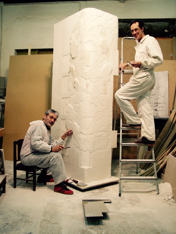 En la foto de abajo, el arquitecto Oscar Tusquets Blanca y el escultor Naxo Farreras trabajando sobre la maqueta de escayola.