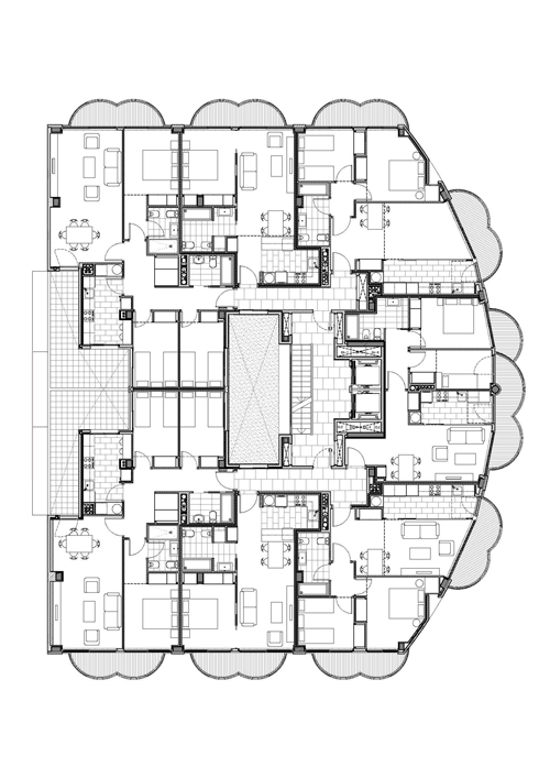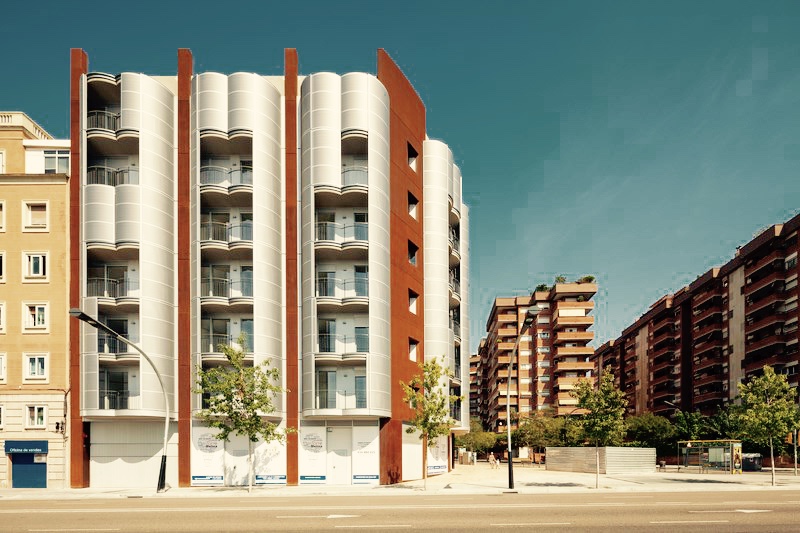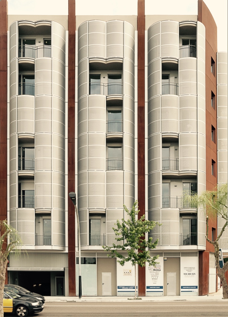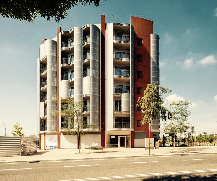 Una solución correcta para un emplazamiento particular, con tres fachadas muy aparentes desde considerable distancia. Una planta correcta donde solamente cuatro dormitorios secundarios dan a patios interiores. Una imagen muy particular de terrazas individualizadas por vivienda, formadas por círculos maclados y protegidas del sol y las vistas por celosías deslizantes.