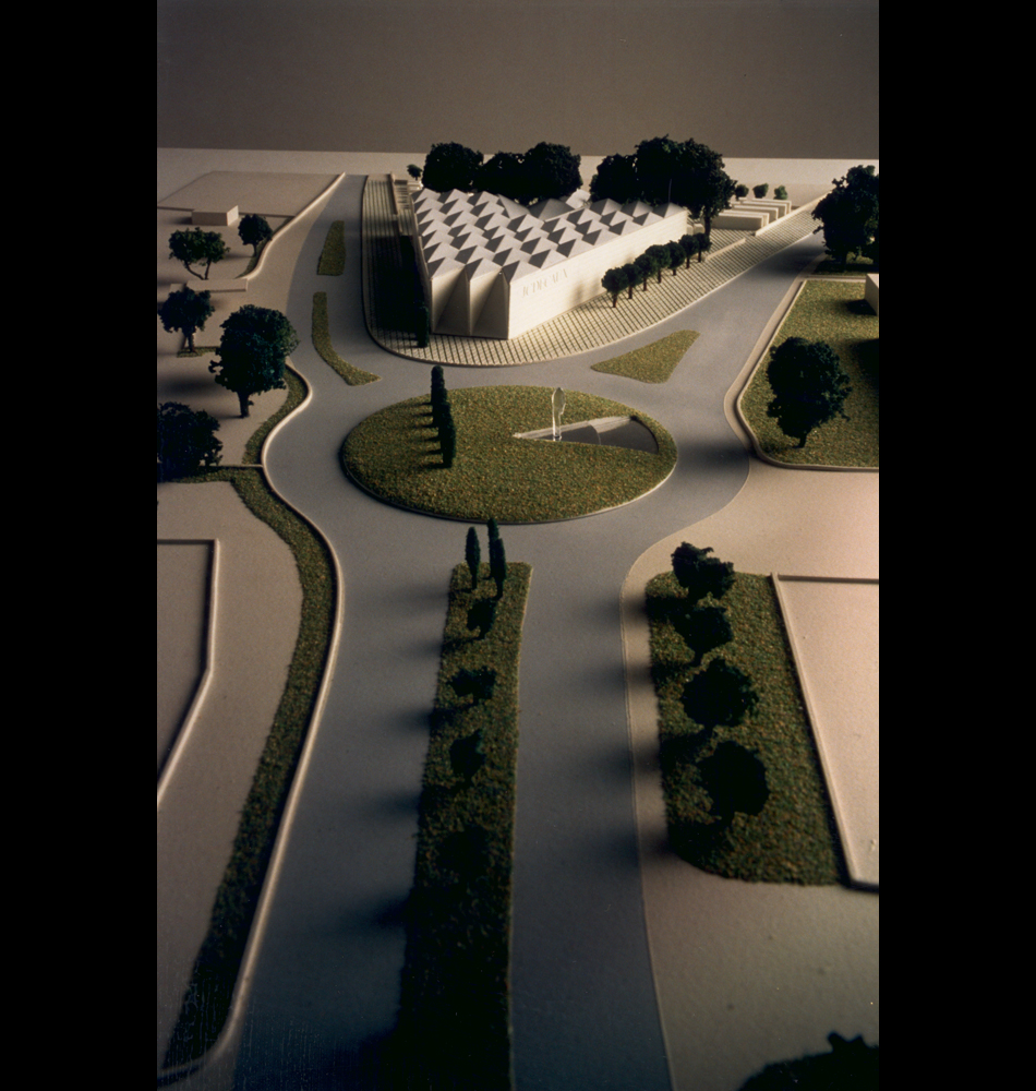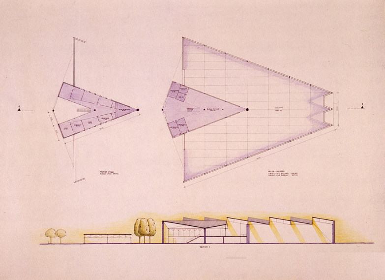 Un terreno triangular frente a una concurrida rotonda. Una fachada forzosamente opaca con el rótulo gigante de DECAUX en la proa. Una cubierta con sheds romboidales que miran a Norte (en su la relación con la estructura reside todo el interés del proyecto). Amor y respeto por la luz natural, no solo justificados por ahorro energético