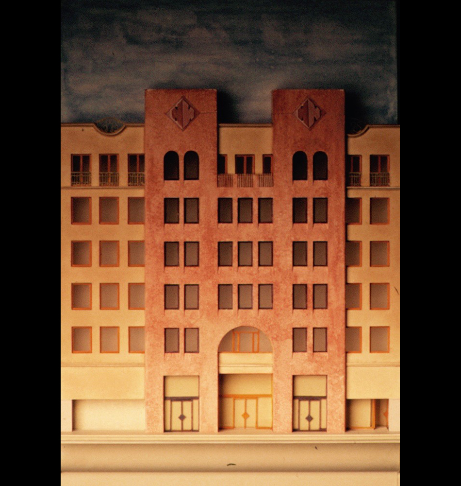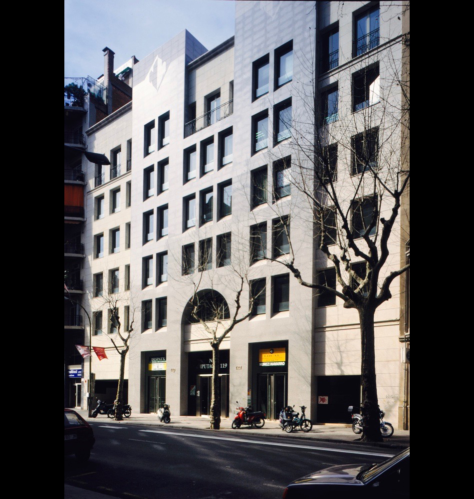 Una fachada muy simétrica, ordenada y pétrea, superpuesta a otra. Un intento de encajar en el Eixample de Barcelona un edificio respetuoso con los colindantes y el siempre difícil y desproporcionado acceso al parking.