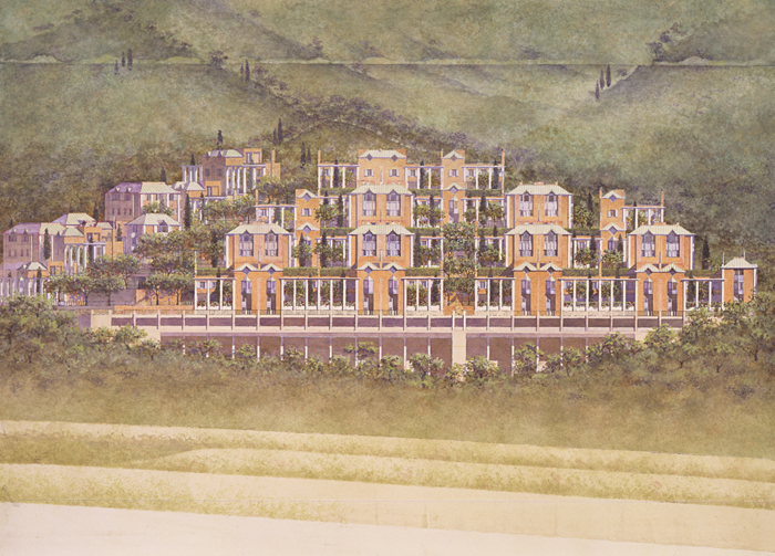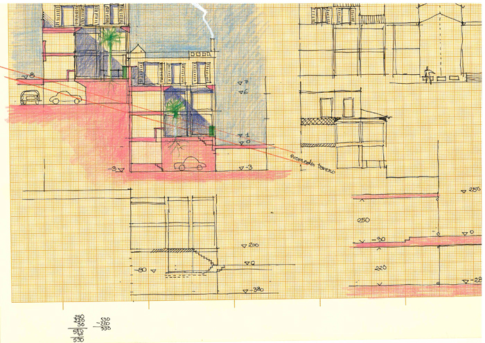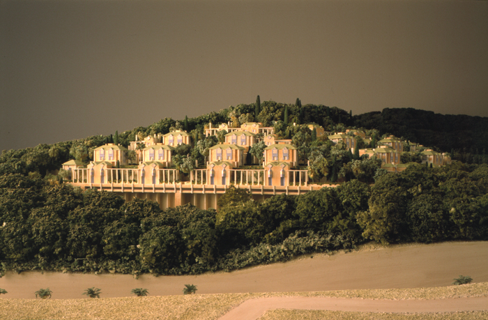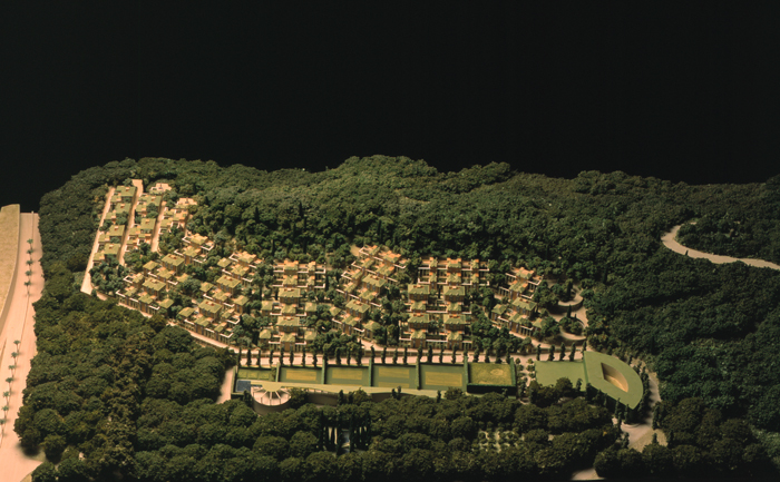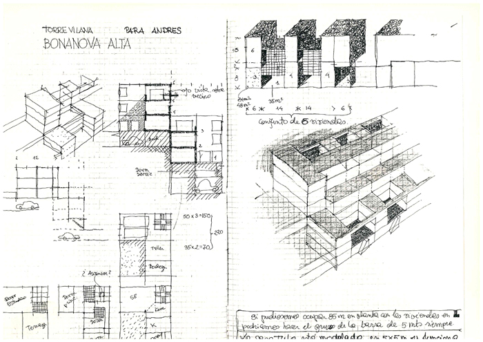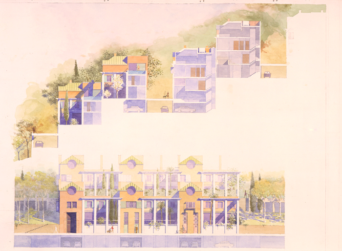 Extenso proyecto de viviendas individuales escalando la falda de Collserola. Máximo empeño en respetar el paisaje procurando acceso rodado a cada una.