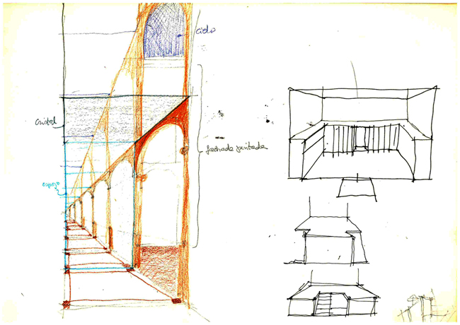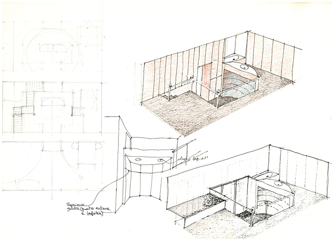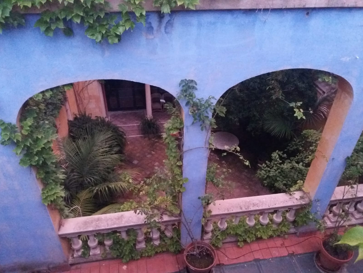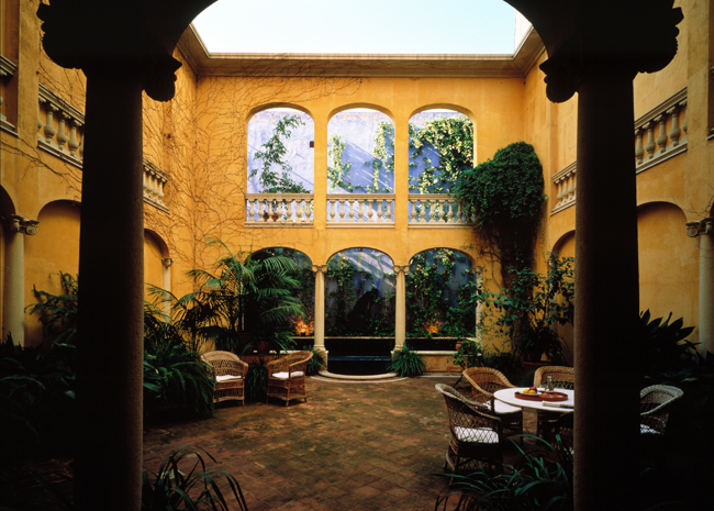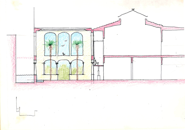 The neglected rear courtyard of the painter Urgell’s former studio converted into an architectural cortile with a fountain-cum-pool to the rear. The broad overhanging cornice closes the space visually and makes it independent of the high party walls. A tribute to the Lutyens of New Delhi.