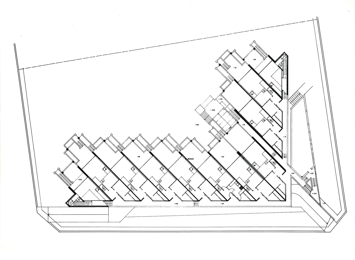 Una serie de viviendas desarrolladas en tres niveles además de un garaje en semisótano. Cierran un jardín colectivo, además de uno privado y un solárium en la cubierta. Máximo aprovechamiento del sol y de la vivienda individual que toca al terreno. Un solo vado para todos los garages: respeto por la continuidad de las aceras.