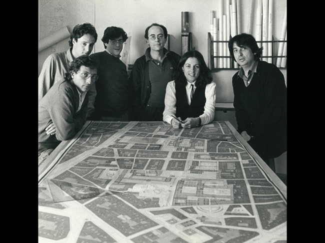 Clotet y Tusquets junto al equipo de colaboradores sobre uno de los planos del proyecto