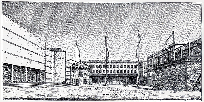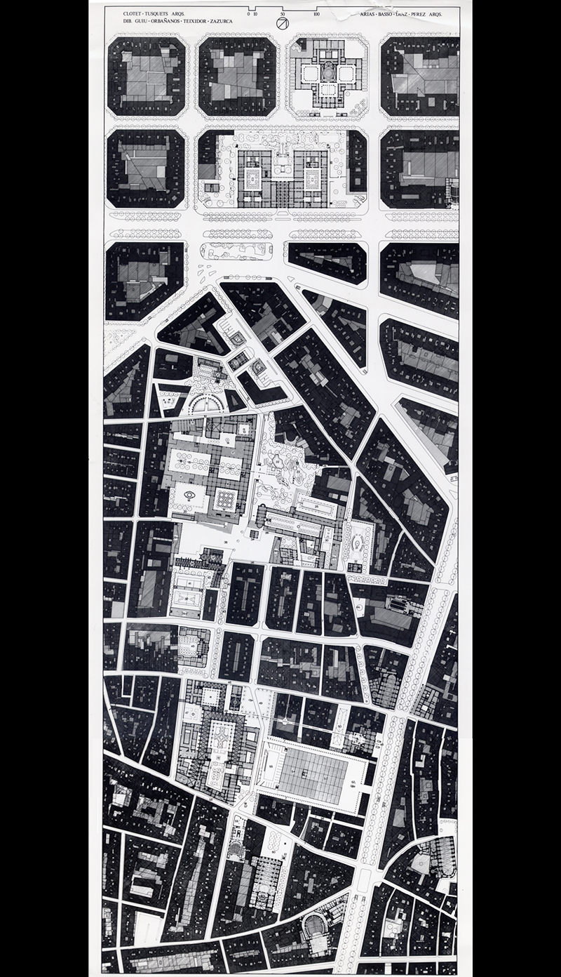 Comenzamos el proyecto en un vinilo de 1 x 4 m donde se representaron las plantas bajas de los edificios públicos importantes. Esto nos permitió apreciar cómo los diferentes arquitectos habían sabido manipular los modelos académicos para adaptarlos al entorno urbano. Toda la propuesta (parte de la cual se ha llevado felizmente a cabo, aunque otra, desgraciadamente, no) era un ejercicio de cirugía, de microurbanismo, que permitía aprovechar las áreas no construidas -o a derribar por insalubres- para crear, respetando la trama y escala urbana, nuevos espacios públicos que esponjasen y dieran nueva vida al barrio del Raval.