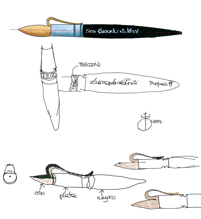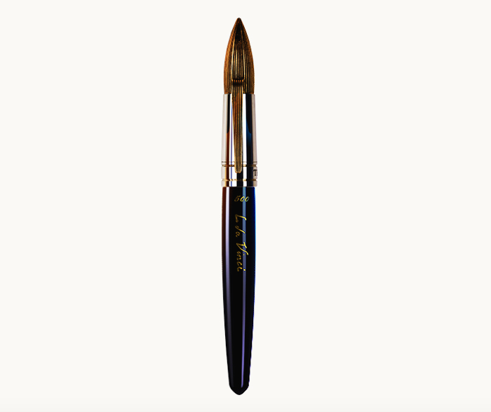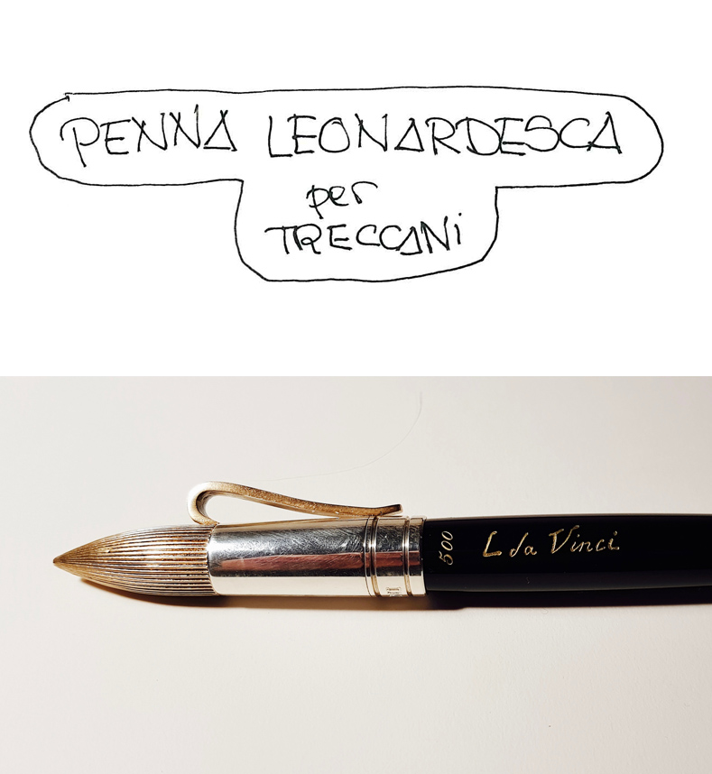 Diseñar una pluma estilográfica para conmemorar los 500 años del fallecimiento de Leonardo es un delicado desafío. La obra de ningún otro artista ha sufrido más interpretaciones kitsch, Cenacolos y Giocondas han invadido todo tipo de bibelots. Mi pluma alude a un pincel, el clip lo forman unos pelos desmelenados y donde habitualmente se sitúa el número que define el grueso aparece la cifra 500. El hecho de que los mejores pinceles de pelo de marta sean de la marca da Vinci es una afortunada coincidencia.