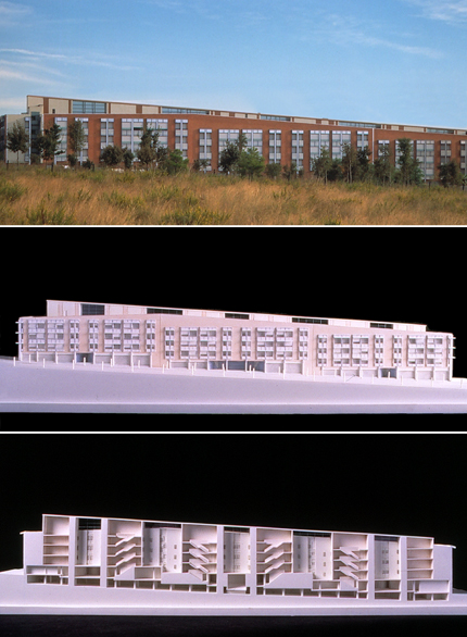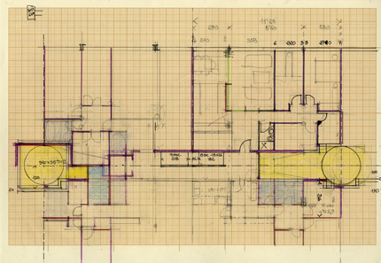 "El urbanista había imaginado un paralelepípedo racionalista pero el terreno obligaba a escalonar el edificio. Solucionamos el problema creando una cubierta inclinada que desagua por los testeros. Remates de patios, maquinarias de ascensores y chimeneas, se agrupan en un solo volumen que constituye la columna vertebral de la cubierta. Estamos bastante satisfechos del encadenamiento de patios y accesos, y de como se comunican: recibidor, sala, comedor, cocina y lavadero."