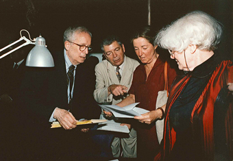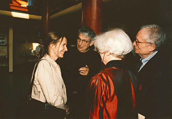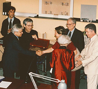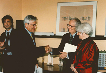 Arriba la obra ganadora. Abajo, Lluís Domènech y Roser Amadó hablando con Denise Scott Brown y Robert Venturi, jurado del premio. Beth Figueras siendo presentada por Oscar Tusquets Blanca a Scott Brown y Venturi. En las dos últimas fotos, el alcalde de Barcelona, Joan Clos, saludando al jurado y a los ganadores del premio.